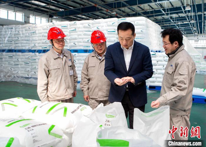 △Zheng Yueming, Deputy to NPC and Chairman of Levima Advanced Materials, Checks the Product Situation of Levima Ethylene-Vinyl Acetate Copolymer (EVA)